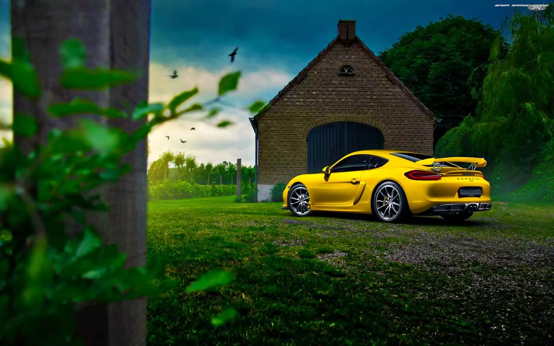 Samochód: Dom, Ptaki, Porsche Cayman GT4, Drzewa